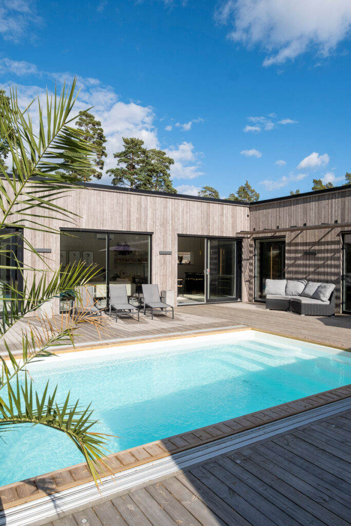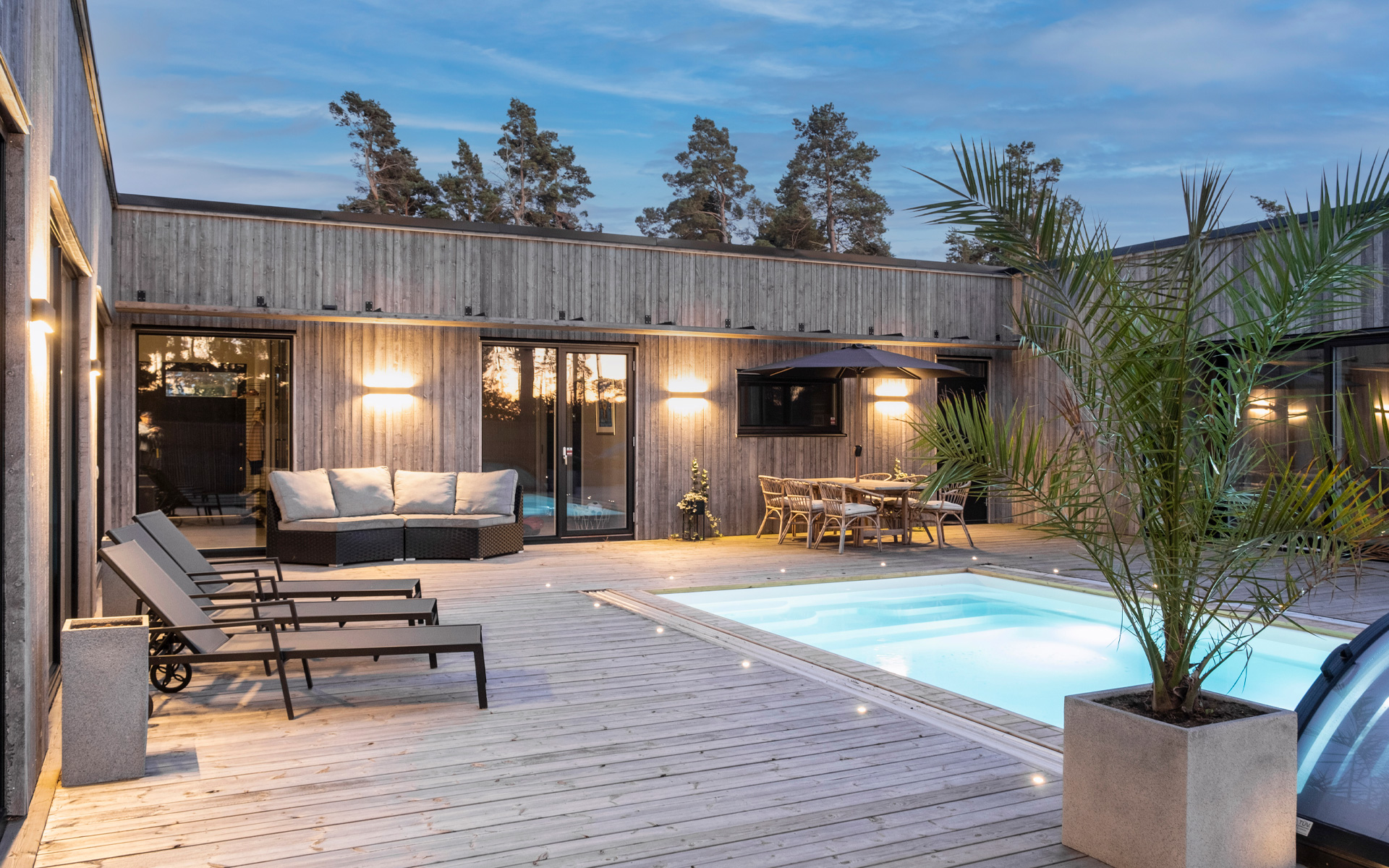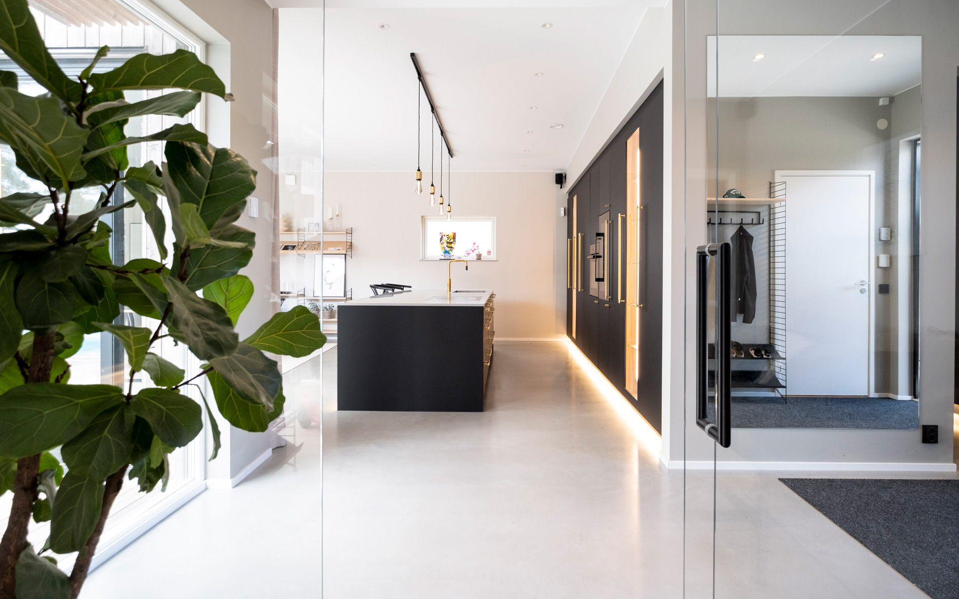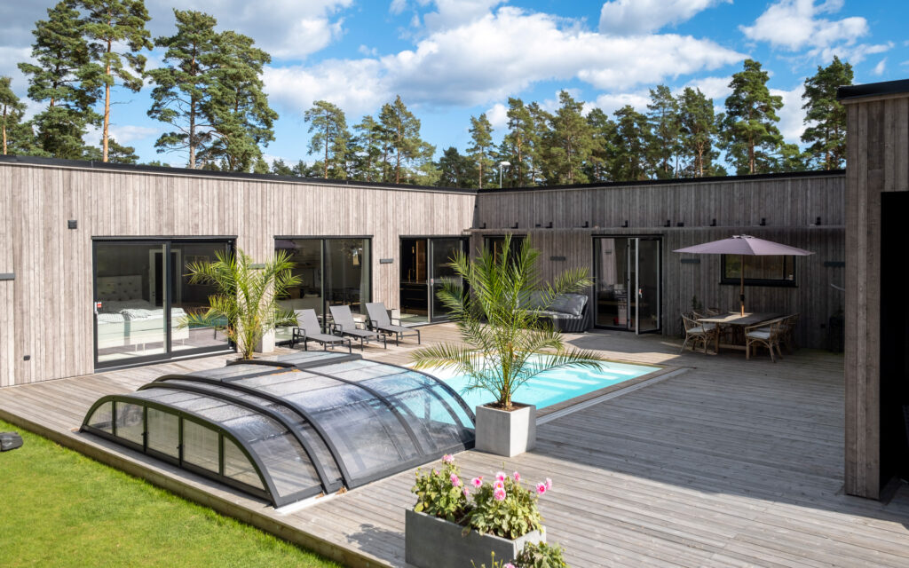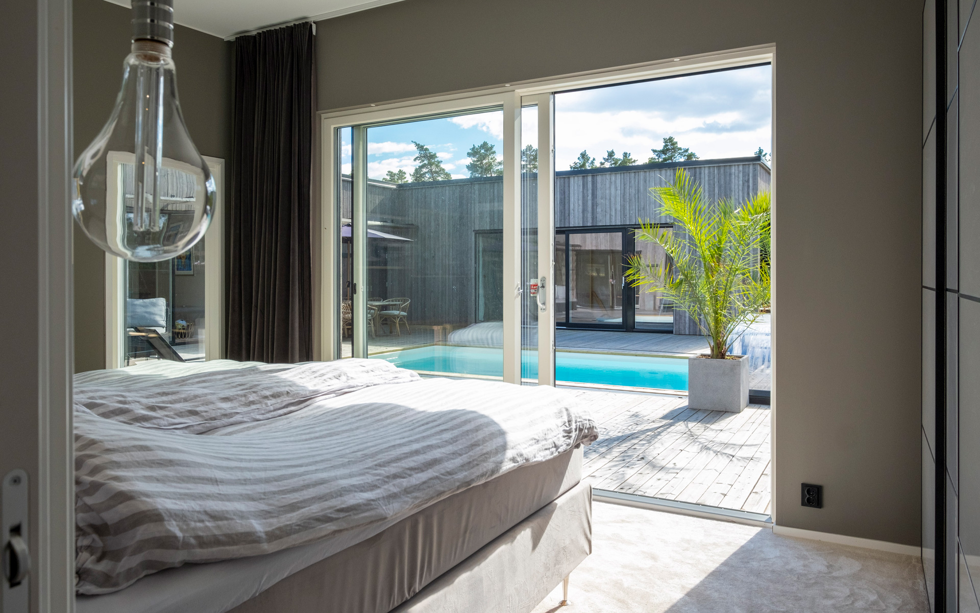 Villan är utformad som ett U-hus med en skyddad innergård – en privat oas där inne och ute möts. Generösa glaspartier mot gården förstärker ljusinsläppet och suddar ut gränsen mellan bostad och utemiljö, samtidigt som husets yttre uttryck är mer slutet och diskret mot omgivningen. Med precision i utförandet och hög slutfinish har vi skapat ett hem som kombinerar funktion, estetik och långsiktig kvalitet – anpassat för familjeliv med exklusiv känsla.