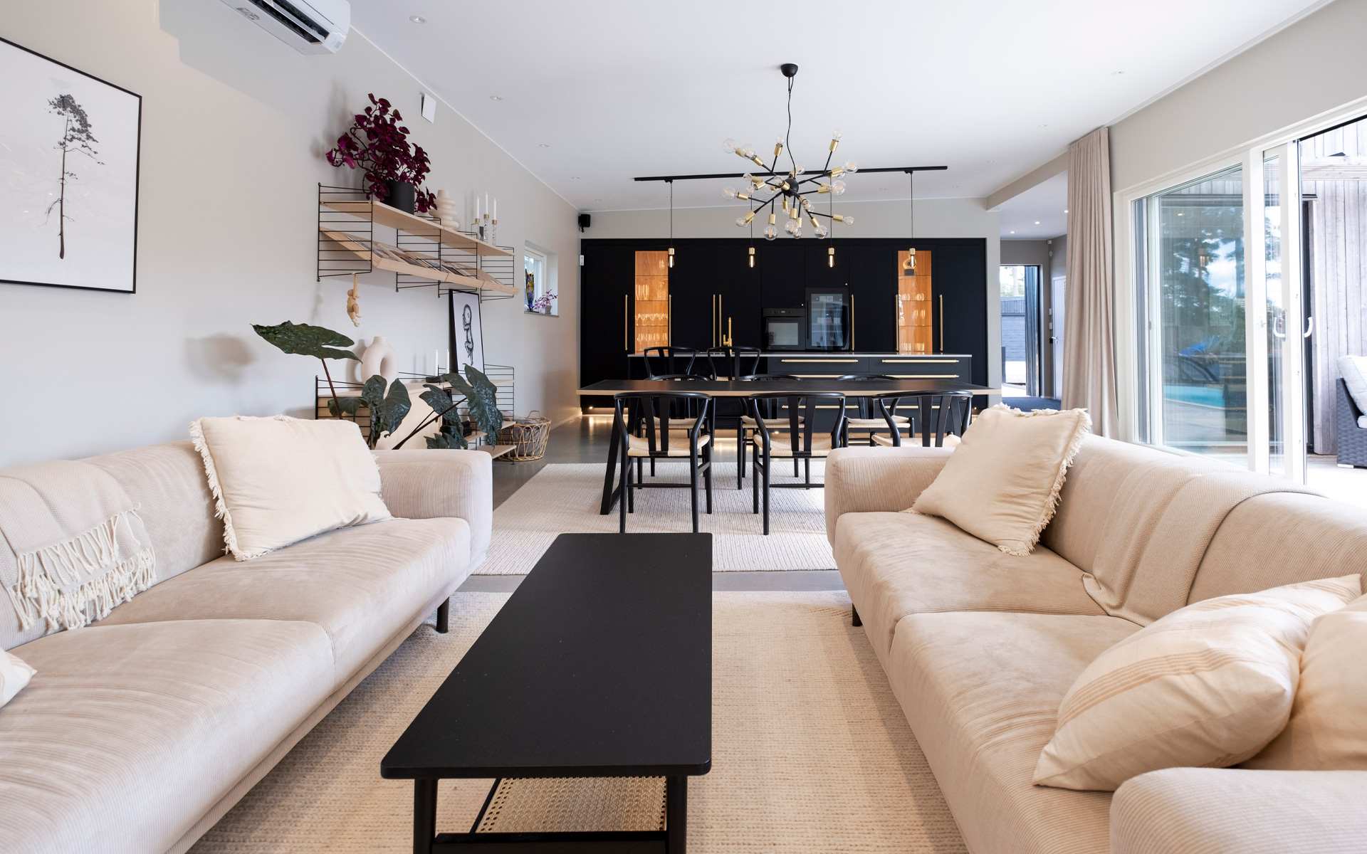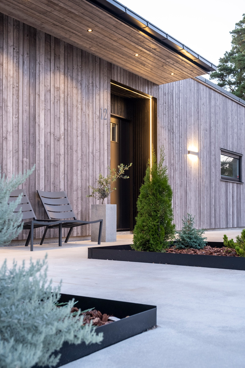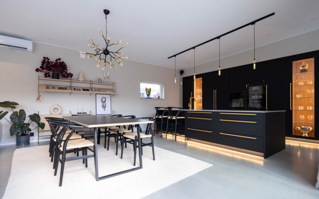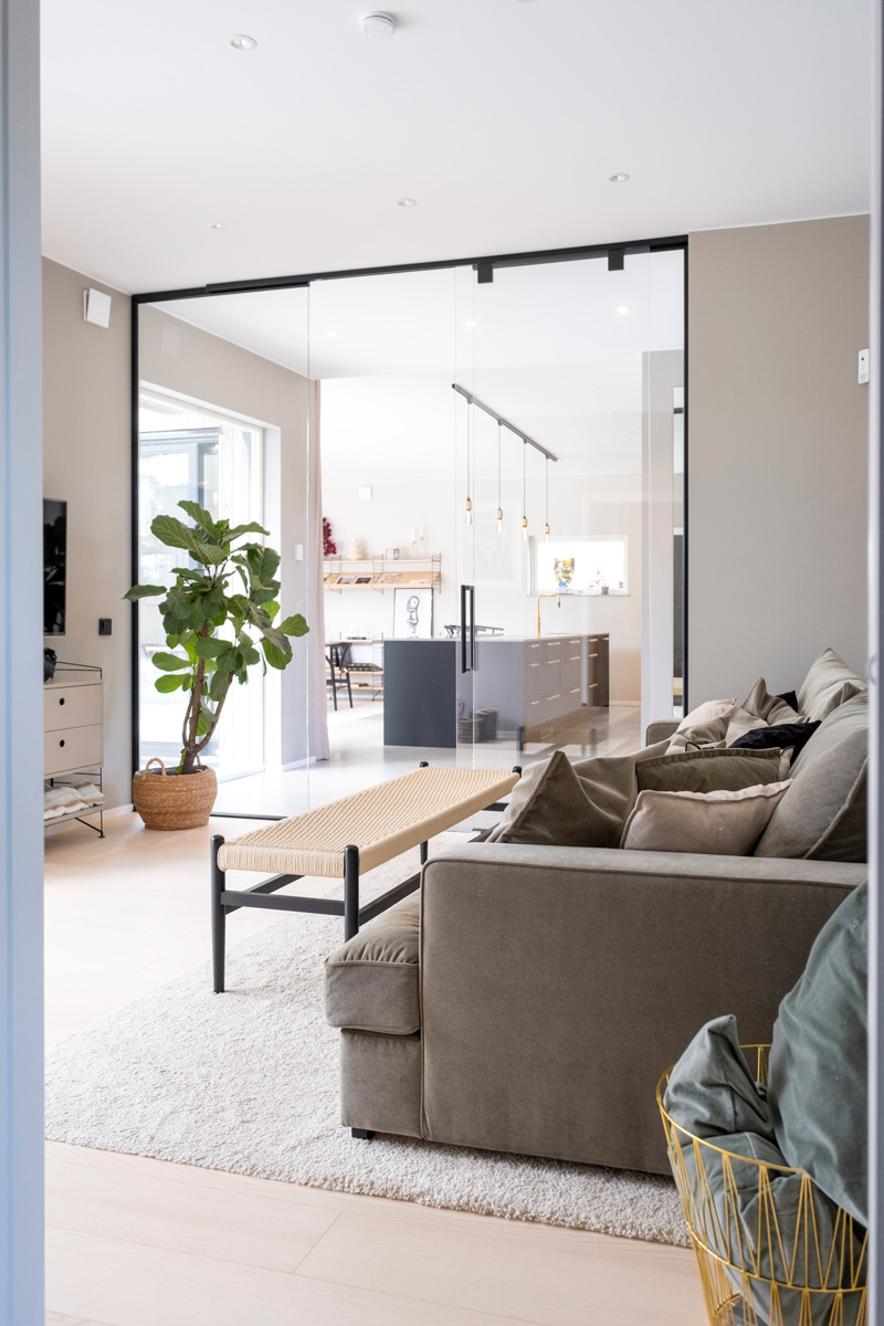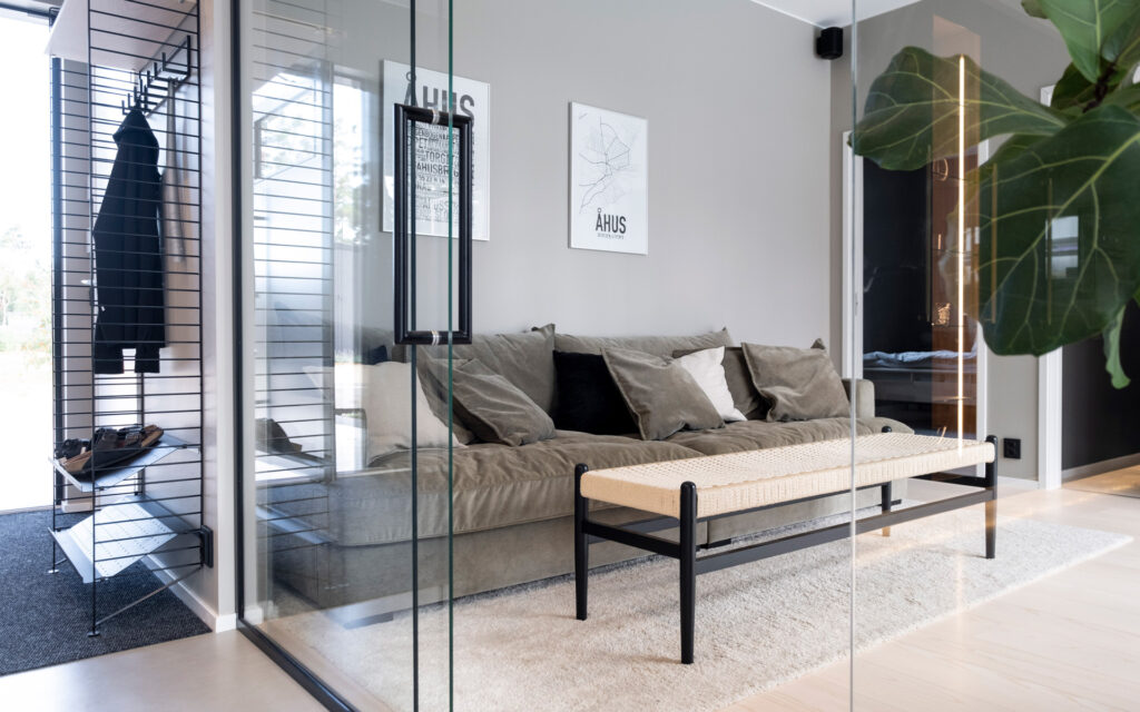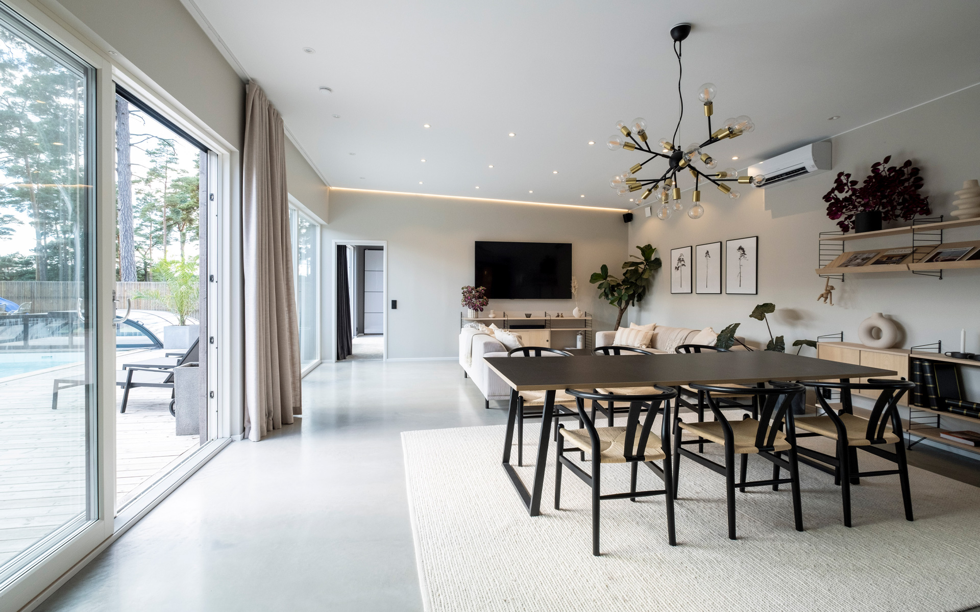 Villan är utformad som ett U-hus med en skyddad innergård – en privat oas där inne och ute möts. Generösa glaspartier mot gården förstärker ljusinsläppet och suddar ut gränsen mellan bostad och utemiljö, samtidigt som husets yttre uttryck är mer slutet och diskret mot omgivningen. Med precision i utförandet och hög slutfinish har vi skapat ett hem som kombinerar funktion, estetik och långsiktig kvalitet – anpassat för familjeliv med exklusiv känsla.